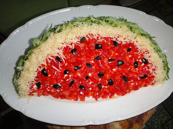 5. Украшение сверху: помидоры- мелко порезанные, огурцы – соломкой +укроп, сыр – на терке, маслины.